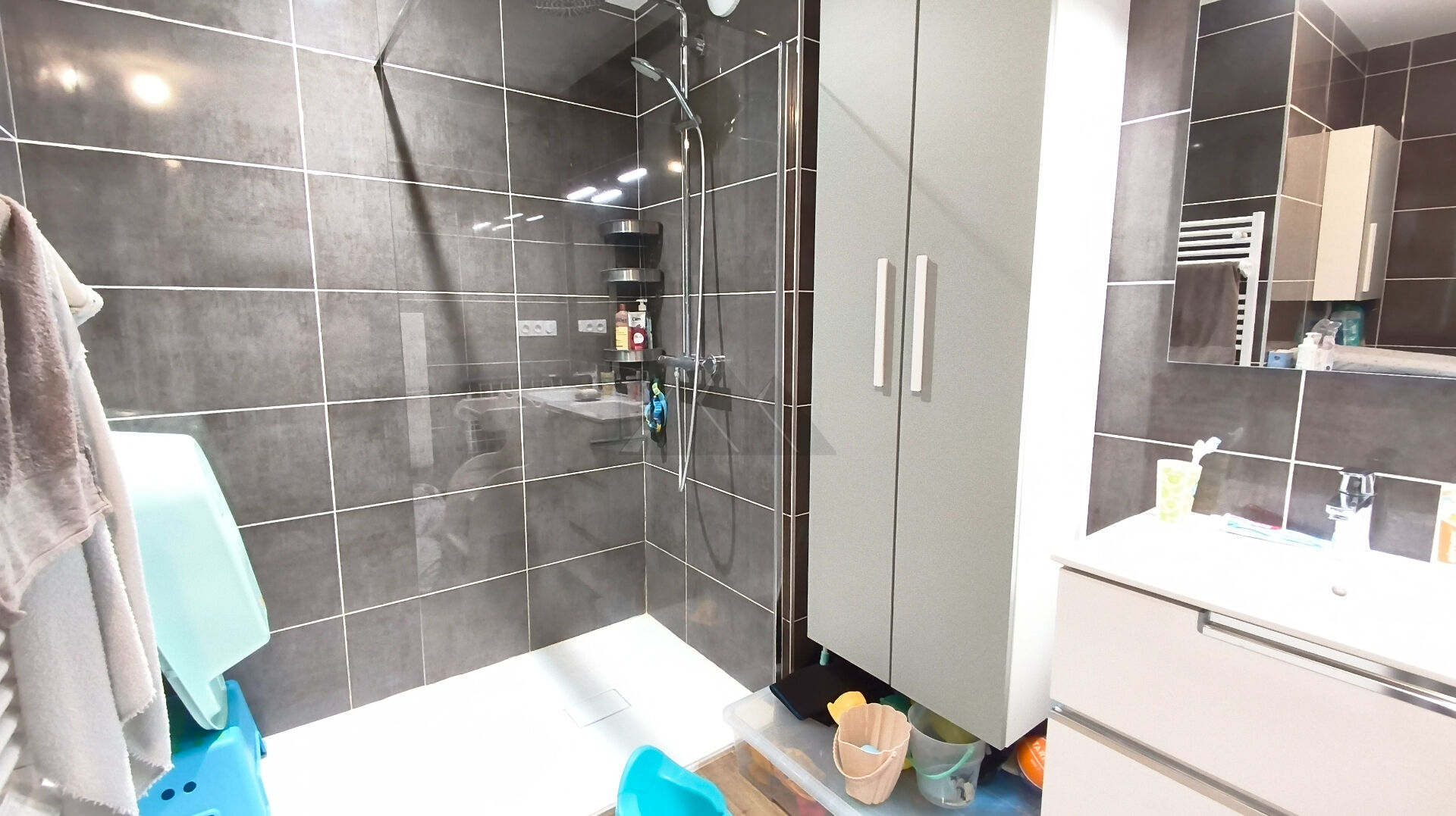 Une grande salle d'eau avec douche à l'italienne.