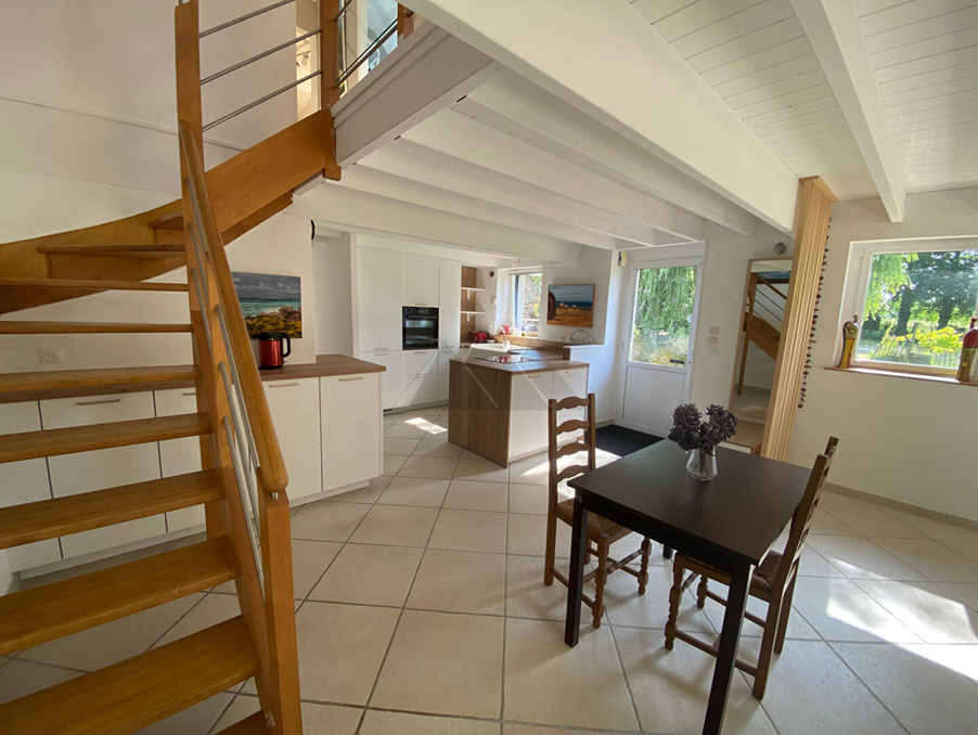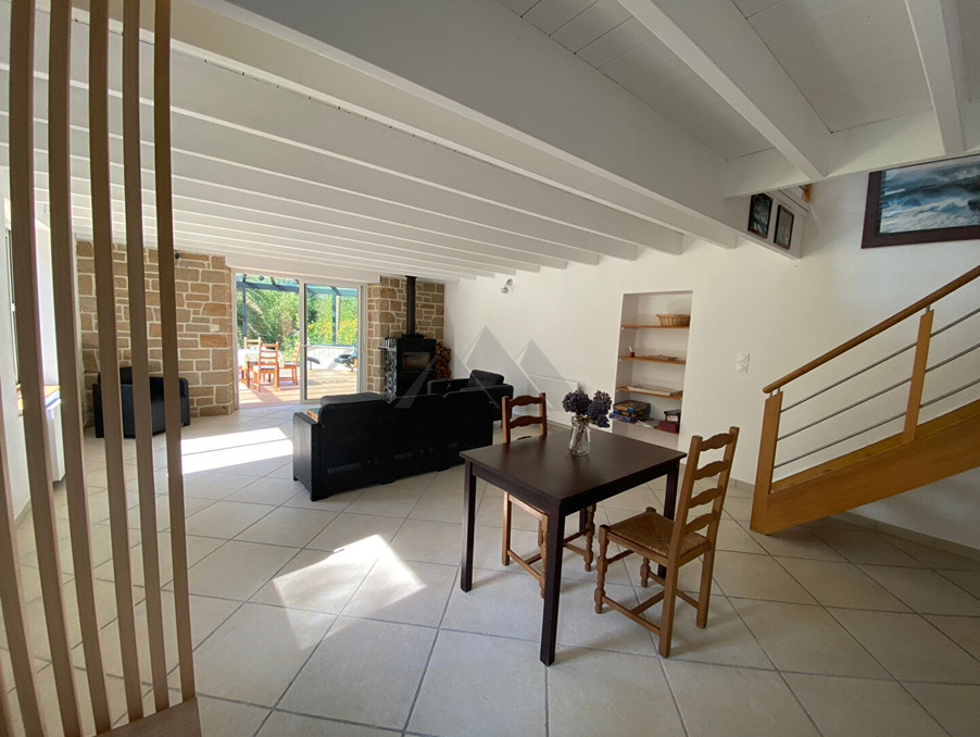 L'habitation principale, chaleureuse et rénovée avec goût, offre au rez-de-chaussée, une pièce de vie spacieuse avec cuisine aménagée équipée récente, une grande véranda lumineuse ouverte sur le jardin, une chambre avec placard dressing et salle d'eau privative, une buanderie, un wc indépendant. A l'étage, une mezzanine faisant office d'espace bureau ou salon, deux chambres supplémentaires, une salle de bains. Une dépendance complète l'ensemble, comprenant, une salle de réception ou de loisirs, une cuisine, des toilettes.