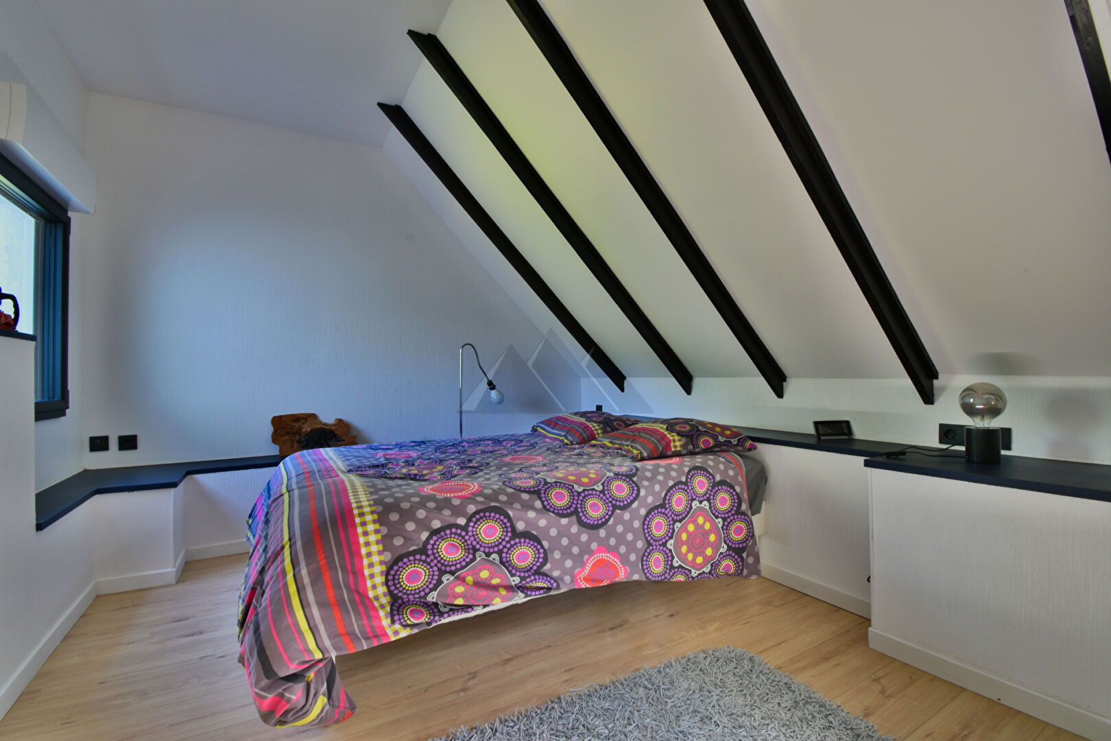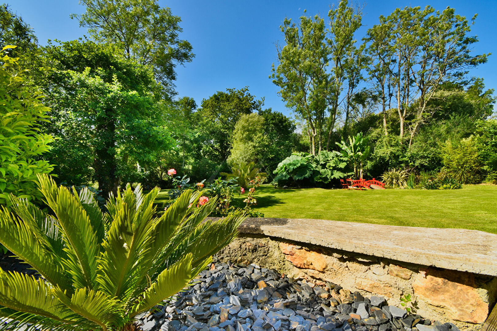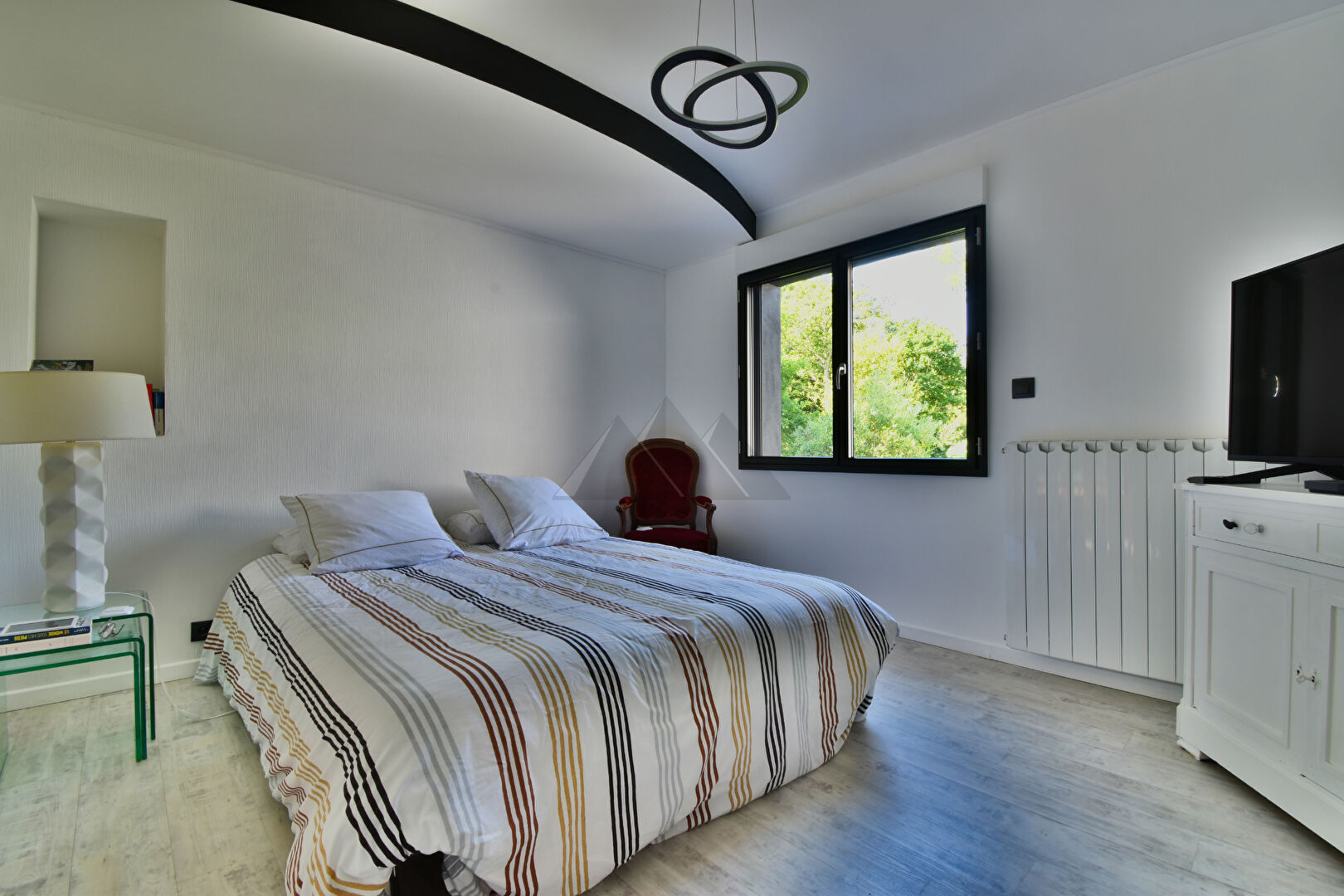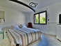 À l'étage, un palier avec vue dominante sur le jardin distribue une chambre d'amis avec salle d'eau privative, une chambre mansardée, ainsi que deux pièces supplémentaires pouvant faire office de dortoir, de dressing ou de salle de jeux.