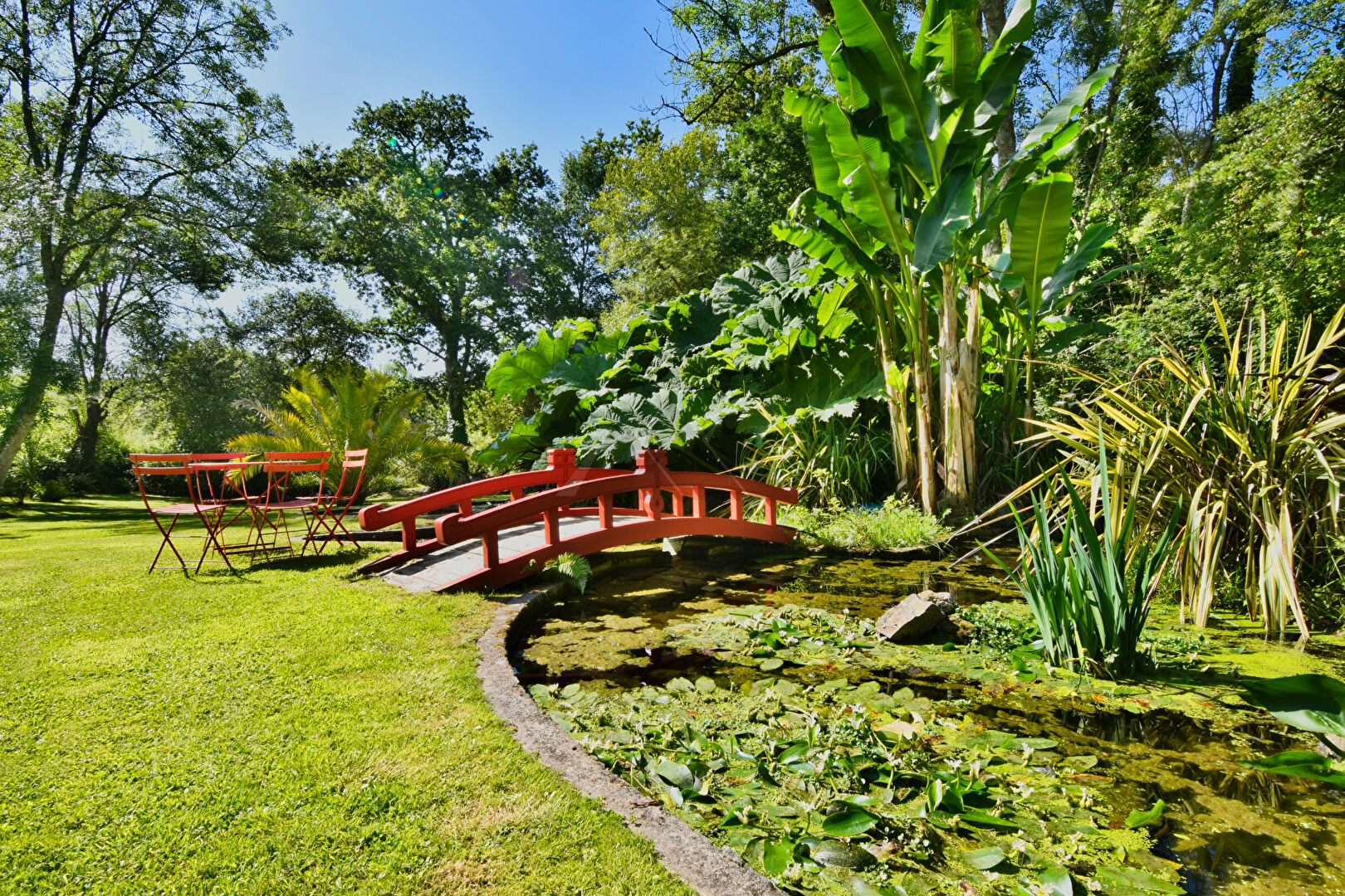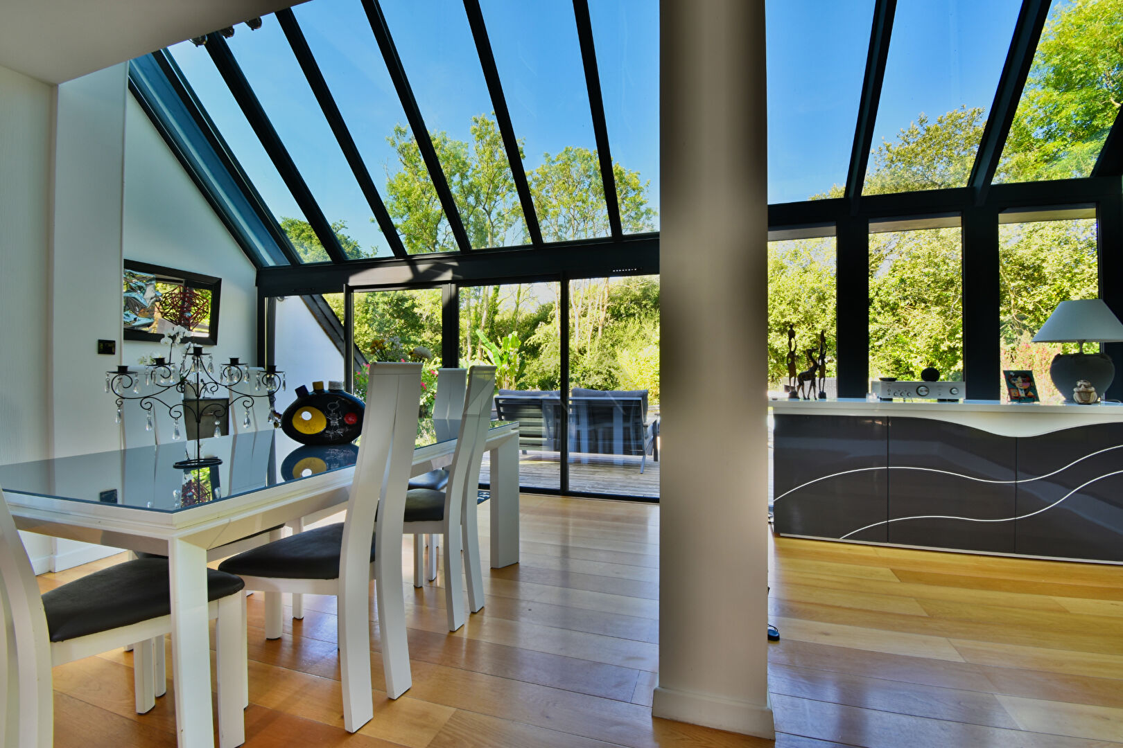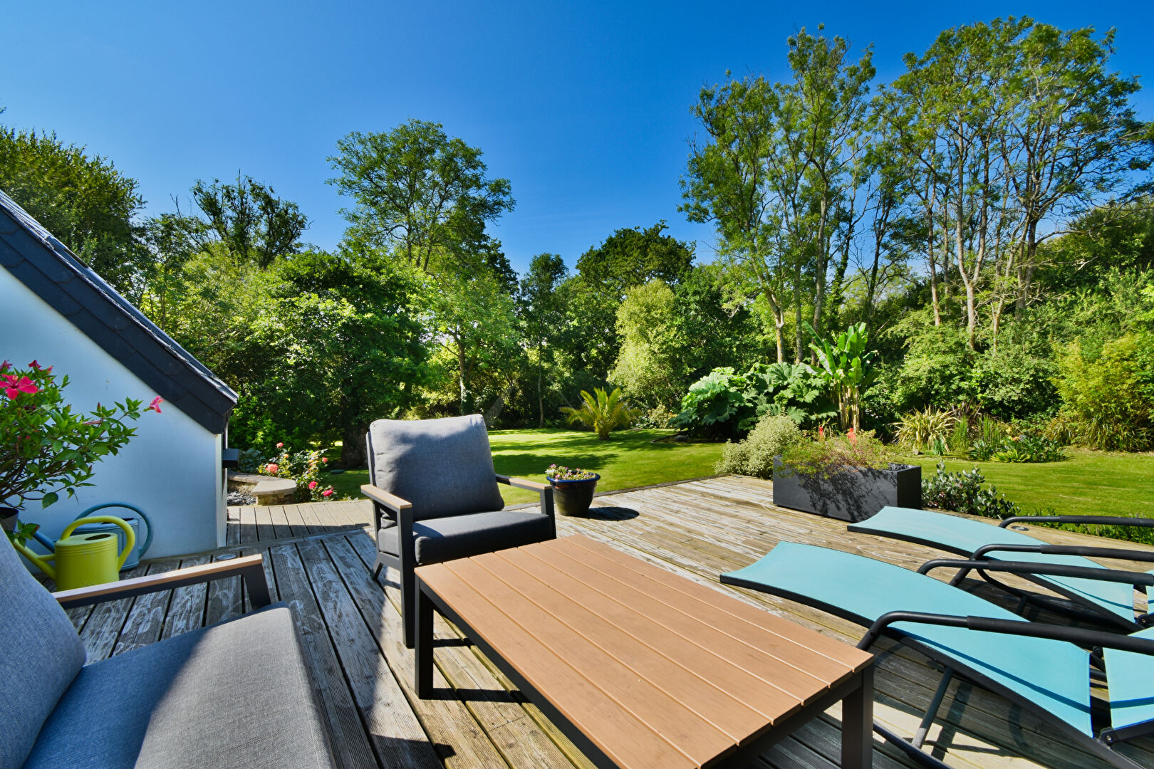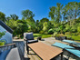 À l'extérieur, une terrasse en bois de 50 m² domine le jardin paysager, traversé par un bras de ruisseau, offrant un cadre naturel unique. Un parking privatif et un abri de jardin complètent les aménagements.